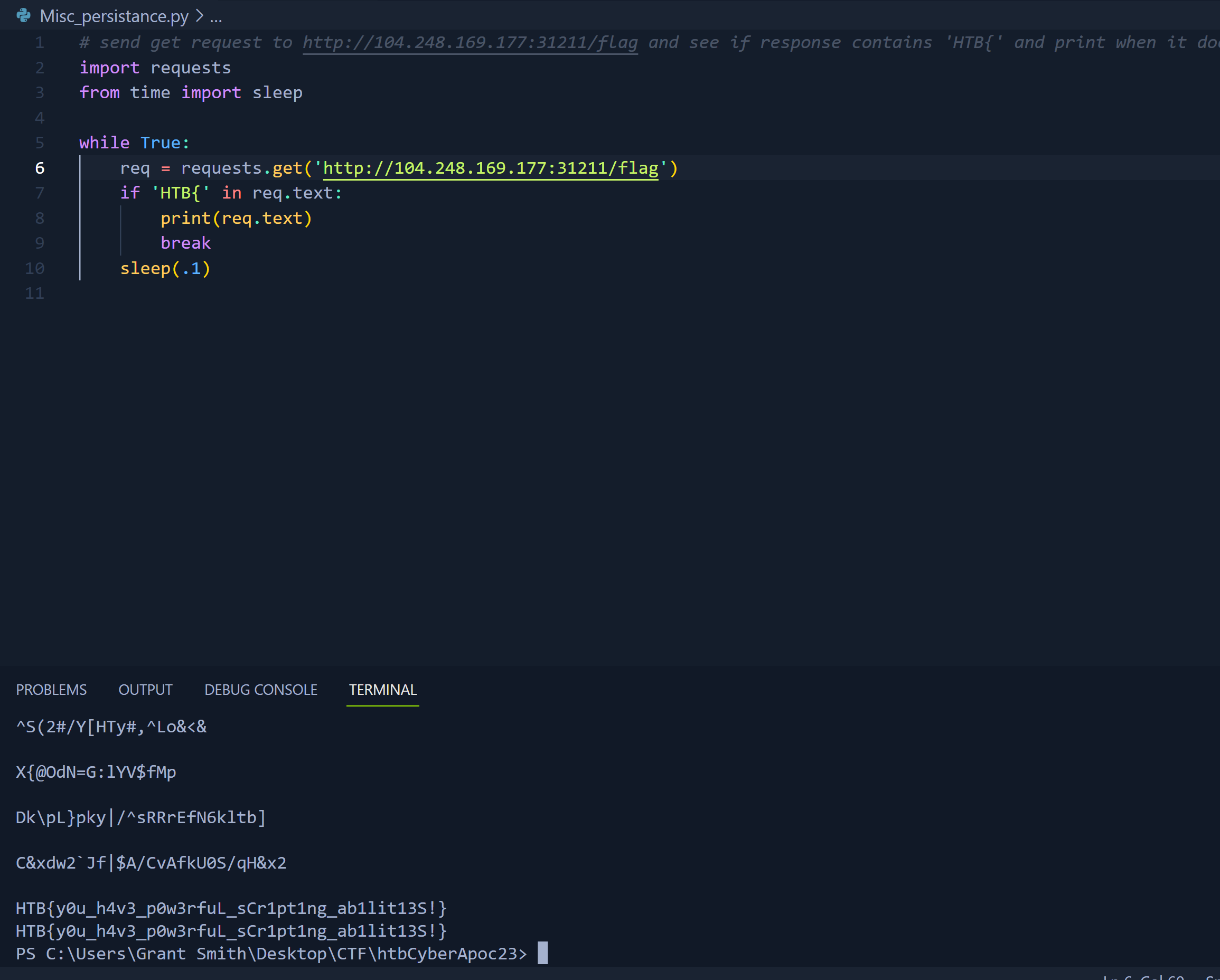 <figure><img src="https://2826773145-files.gitbook.io/~/files/v0/b/gitbook-x-prod.appspot.com/o/spaces%2F1uhiofTFnZvCKEvs4fJk%2Fuploads%2FCqPNfTIsTVOlZNBiZeOU%2FhtbCyberApoc23_Persistance.PNG?alt=media&#x26;token=cb40c52c-3906-4904-863c-116e217c4138" alt=""><figcaption><p>Simple Python script to request until it gets the flag</p></figcaption></figure>